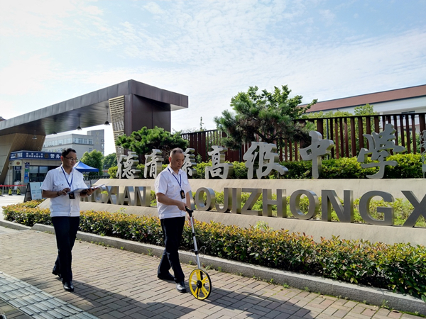 德清縣煙草專賣局市場管理員在現場測量零售點與周邊學校距離。黃麗莎攝