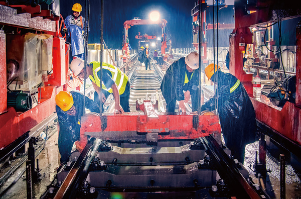 近期持續降雨,強對流天氣頻發,給承擔金義線金塘區間鋪軌任務的中鐵六局施工帶來不小的困難。120名鋪軌人員頂風冒雨,東西兩個作業面同時對鋪,僅用13天就鋪設3.2公里。隨著金塘區間右線軌通,電動客車可以從塘雅車輛段大本營進入正線直通金華站,電纜、信號等直通金義東軌道的“大腦”——控制中心。