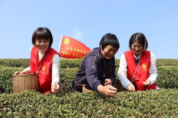 義烏市煙草專賣局“鴻雁行”黨員志愿者幫助山區茶農采摘春茶。樓倩倩攝