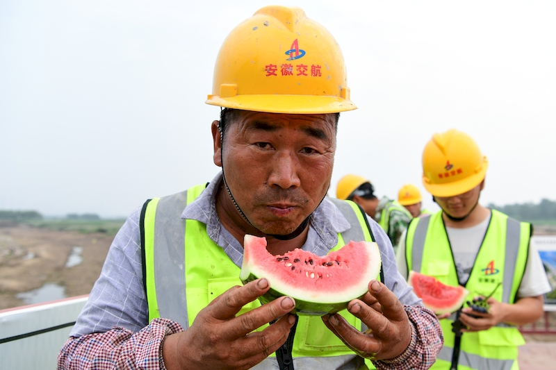 在引江濟淮(安徽段)巢湖湖區航道及派河口服務區,嚴店鄉志愿者向建設者們送上水果。人民網安徽頻道了解到,作為引江濟淮工程的大項目,派河口服務區于去年11月開工,目前正在進行土方開發、地基處理,預計于2022年底完整交付。