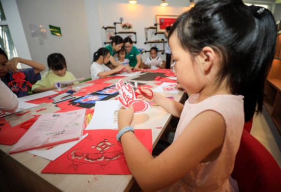 在昌碩街道天目社區幸福鄰里中心,志愿者教孩子們剪紙。張卉攝