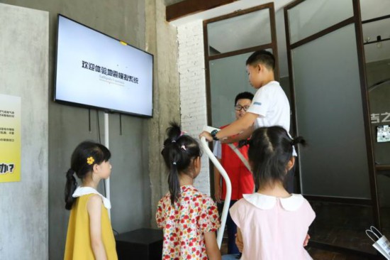 孩子在昌碩街道玉磬社區防震減災科普教育基地體驗地震模擬系統。