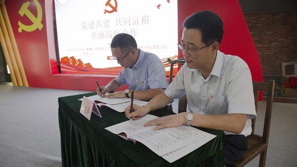 建行舟山普陀支行黨總支與普陀區螞蟻島管委會工作委員“黨建共建 共同富!比鎽鹇院献鲄f議簽署。建行舟山普陀支行供圖