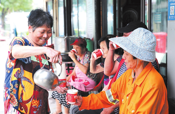 近日,在湖州市德清縣乾元鎮西郊社區西郊路55號,熱心市民陳桂珠在為前來茶攤的居民添茶水。2016年夏天,陳桂珠接手免費涼茶攤,向過往居民免費供應茶水至今。(倪立芳、沈嬋娟)