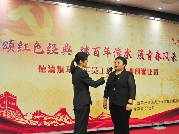 黨員零售戶代表李楠(右)參加湖州煙草舉辦的紅色經典朗誦比賽。朱玲莉攝