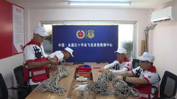 當天,在永嘉縣紅十字飛龍救援隊會議室內,救援隊水上救援組組長葉岳杰正在培訓新隊員如何使用救援繩索!八暇仍K索不能綁在自己身上,要往落水人員頭部拋,盡量保證準確度,拋到后要兩個人配合往回拉,確保自己的安全!比~岳杰說,由于永嘉縣山區小溪流、溝壑較多,水上救援有一定難度,他們更新了設備,培訓大家使用拋投器等救援工具。