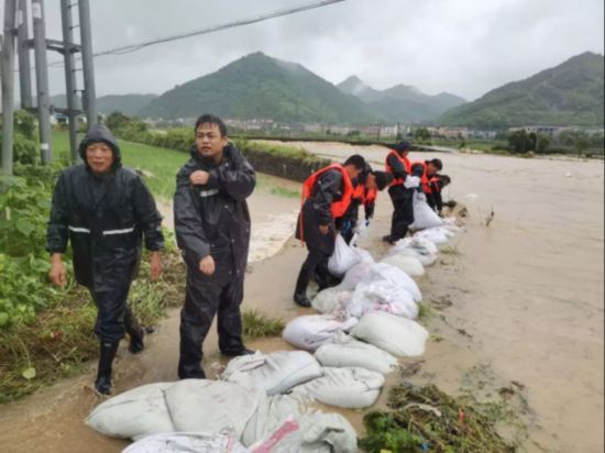 7月24日下午,巡特警大隊隊員和群眾一起在浙江諸暨應店街雙龍長塘頭村筑防洪堤。