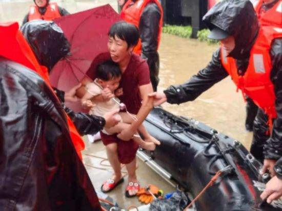 7月24日上午紹興市柯橋區公安分局巡特警大隊分先后分兩批共計97名警力參與救援。在湖塘街道香林村西路自然村,巡特警民警、輔警參與被困群眾轉移工作,架設沖鋒舟將村里老人、兒童轉移至安全區域。