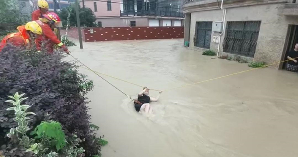 7月25日0時40分,寧波市區永豐路13號附近因姚江水位驟升,江水漫上道路倒灌家中,有人員被困,亟待救援。消防救援人員蹚過半米深的水,將8名被困人員一一帶離積水地帶。