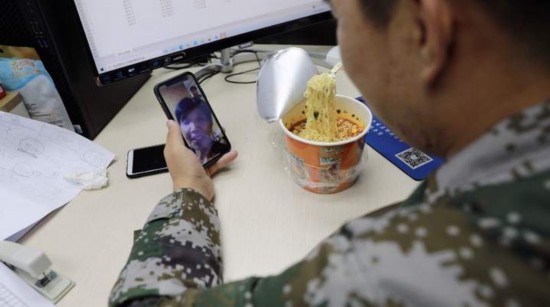 趁著中飯間隙,他和老家的父母短暫視頻聊天。