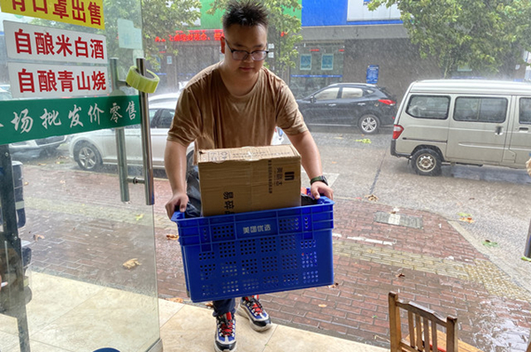 諸暨市煙草專賣局工作人員在臺風來臨前幫助零售戶轉移物資。壽越江攝