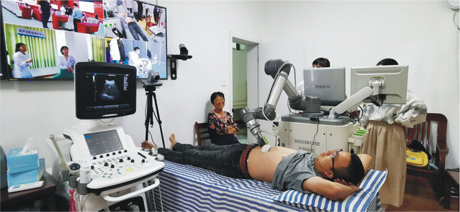 通過5G網絡和4塊直播屏幕,上海市第六人民醫院、臺州市立醫院和大陳鎮衛生院牽手組建了“網絡診療會議室”。上海的國內一流超聲專家遠程遙控操作海島上的機器人,排查陳桂花的脖頸上有無異狀。上海專家實時觀看了B超的整個操作后對患者的斑塊進行評估,認為這是相對穩定的斑塊,總體問題不大,建議患者注意血糖、血壓的指標控制,注意隨訪。