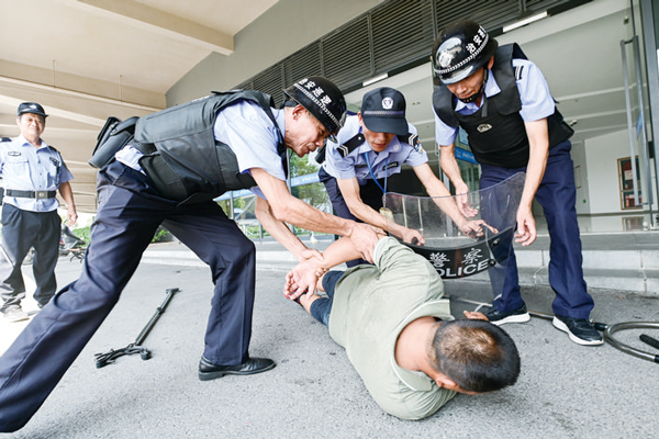 近日,金華市全民健身中心亞運省運比賽場館前,數名安保人員正快速控制住一位“暴徒”,確!百愂隆卑踩。當天,為強化和檢驗亞運省運比賽場館工作人員對突發事件的快速反應能力、聯動協作能力及現場處置能力,市全民健身中心舉行消防和反恐演練,提高員工處置突發事件應急能力,增強大型賽事活動保障能力。(胡肖飛)
