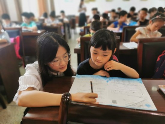 這個暑期托管班設置了心理健康教育、國學、名著導讀、德育電影等學生喜聞樂見、平時課堂中學不到的知識點。班里有3名老師,分別是本校教師、社工助教以及大學生志愿者,3人組成暑期托管服務師資。開班儀式后,孩子們開始了托管的第一堂課《國學啟蒙》,該校副校長葉世蠻耐心分析講解,孩子們聽得津津有味。