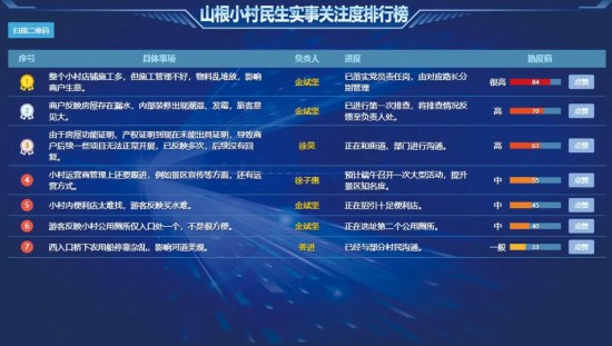 推出山根小村民生實事關注度排行榜,實行線上征集、上榜公開、搶單認領、干部協助、結果評價等全過程閉環管理。山根社區黨委和小村黨支部根據點贊排行優先解決“熱點問題”,每周晾曬進度和關注度,自我加壓促化解。