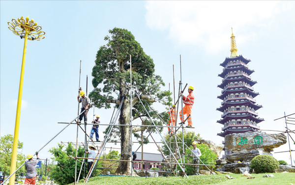 近日,金華市區萬佛塔公園內,園林工人為一棵大樹搭建遮陽棚,防止其被曬傷。面對一輪輪高溫天氣,園林綠化部門通過防曬、輸液、噴灑抗蒸騰防護劑,以及采用漫灌、噴灌、滴灌相結合的澆水方式,對市區上百萬余株綠植進行“清涼特護”。(李建林)