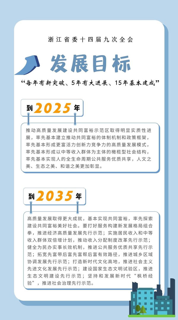 全會強調,要全面落實中央《意見》明確的“兩階段發展目標”,按照“每年有新突破、5年有大進展、15年基本建成”的安排壓茬推進,滾動制定五年實施方案,迭代深化目標任務,只爭朝夕、蹄疾步穩向共同富裕目標邁進。到2025年,推動高質量發展建設共同富裕示范區取得明顯實質性進展,率先基本建立推動共同富裕的體制機制和政策框架,率先基本形成更富活力創新力競爭力的高質量發展模式,率先基本形成以中等收入群體為主體的橄欖型社會結構,率先基本實現人的全生命周期公共服務優質共享,人文之美、生態之美、和諧之美更加彰顯。到2035年,高質量發展取得更大成就,基本實現共同富裕,率先探索建設共同富裕美好社會。要打好服務構建新發展格局組合拳,推進經濟高質量發展先行示范;實施居民收入和中等收入群體雙倍增計劃,推動收入分配制度改革先行示范;健全為民辦實事長效機制,推進公共服務優質共享先行示范;拓寬先富帶后富先富幫后富有效路徑,推進城鄉區域協調發展先行示范;打造新時代文化高地,推進社會主義先進文化發展先行示范;建設國家生態文明試驗區,推進生態文明建設先行示范;堅持和發展新時代“楓橋經驗”,推進社會治理先行示范。