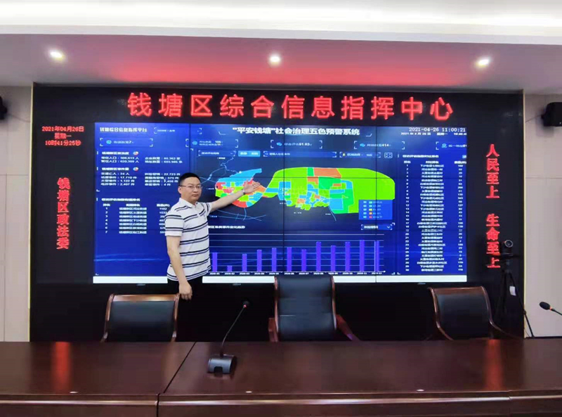 錢塘區委政法委相關負責人講解平安錢塘社會治理五色預警系統。錢塘區委政法委供圖