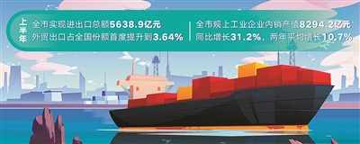 今年上半年,全市進出口規模創歷史同期最好水平,實現進出口總額5638.9億元。外貿出口占全國份額首度提升至3.64%,出口“第五城”地位更加鞏固。與此同時,企業拓內銷、發展新業態步伐穩健。上半年,全市規上工業企業內銷產值8294.2億元,同比增長31.2%,兩年平均增長10.7%,增速均高于出口交貨值。