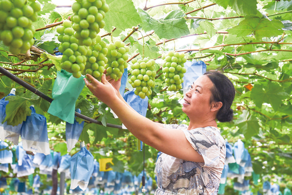8月10日,在金華市金義新區孝順鎮的“程宏農業”葡萄大棚里,通過數字智能化管理的51畝“陽光玫瑰”葡萄呈現喜人的豐收景象,這幾天企業正安排人手采摘成熟的葡萄,并通過快遞銷往廣州、深圳、西安等地。(時寬兵)