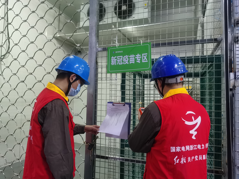 國網杭州城北供電分公司員工正在檢查英特物流新冠疫苗專區的電力情況。國網杭州城北供電分公司供圖