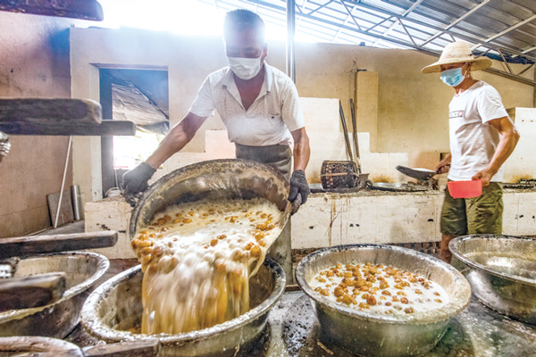 8月15日,在金華蘭溪市蘭江街道姚村蜜棗加工點,村民用傳統工藝生產加工金絲琥珀蜜棗,8口大鍋一字排開,青棗在糖汁里慢慢變色、熟透,變得晶瑩透亮。蘭溪市蜜棗制作技藝非遺傳承人湯美娟介紹,當前是加工旺季,除了老顧客上門購買,他們還通過微信銷售到各地。(時寬兵)