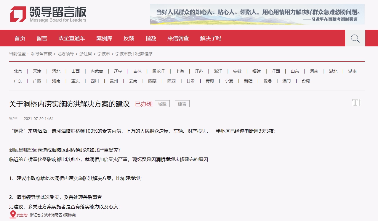 “‘煙花’來勢洶洶,造成海曙洞橋鎮100%的受災內澇,上萬的人民群眾房屋、車輛、財產損失,一半地區已經停電斷網3天3夜……”7月29日,一網友在人民網“領導留言板”上留言,提出實施海曙區洞橋鎮內澇解決方案的建議。留言稱:“到底是哪些因素造成海曙區洞橋鎮此次嚴重受災?臨近的方橋奉化受影響都比以前小,就洞橋加倍受災嚴重,現懷疑是因洞橋堤壩未修建完的原因!边@名網友留言建議相關部門就此次內澇實施解決方案,并妥善處理善后事宜。