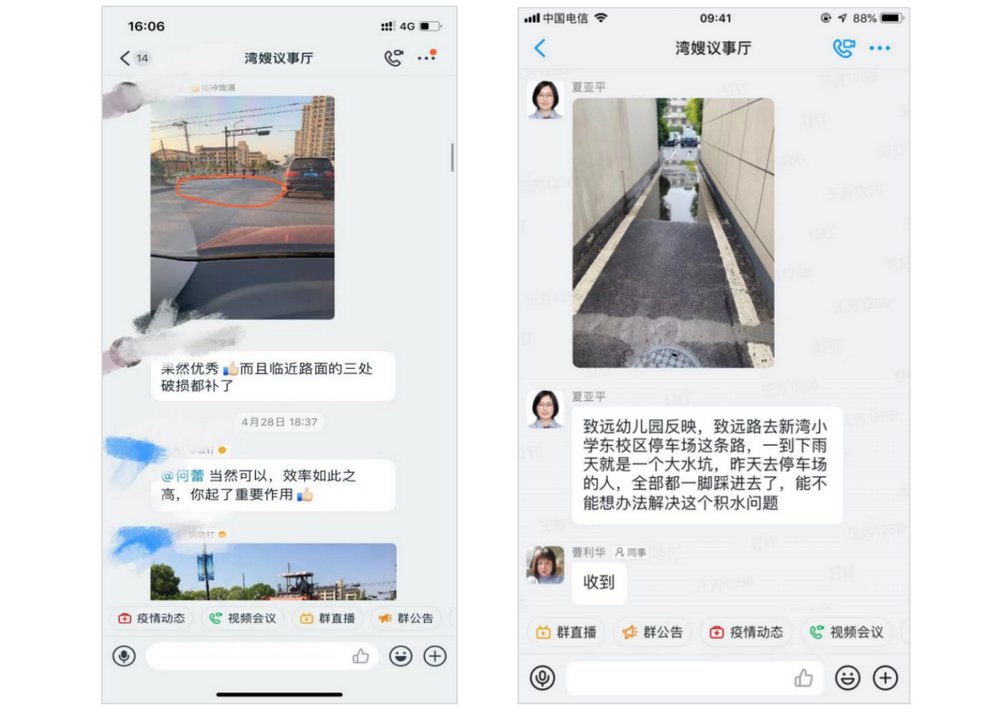 在錢塘區新灣街道“灣嫂議事廳”釘釘群中,經常能看到有關民生問題的訴求。發現問題,灣嫂們立刻在群里提出;問題一出,灣嫂們立刻通過線上及時上報有關部門并及時跟進執行進度,將解決情況一一反饋到群內,迅速解決居民難題。