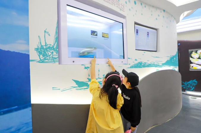LED燈光、淡藍色水波紋、黃魚圖案......走進大陳黃魚文化陳列館,一股現代科技風迎面撲來!拔覀儓鲳^里有一個透明屏互動系統,在這里,市民可以通過一塊透明的顯示屏看到大陳黃魚養殖的介紹!贝箨愭偨洶l辦干部介紹,大陳黃魚文化陳列館充分利用高新科技,以智能融合應用為特色,通過智能化、數字化,進一步生動地展示黃魚文化。