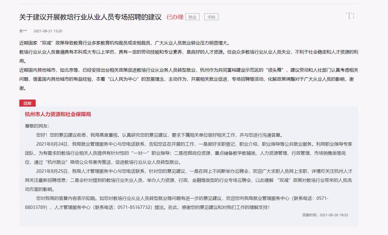 該網友表示,近期國內其他城市如北京等,已經安排出臺相關政策促進教培行業從業人員轉型就業,杭州作為共同富裕建設示范區的“領頭雁”,建議杭州勞動和人社部門認真考慮相關問題,借鑒國內其他城市的有益經驗,本著“以人民為中心”的發展理念,主動作為,開展相關就業促進、專場招聘等活動,化解政策調整對于廣大從業人員的影響。