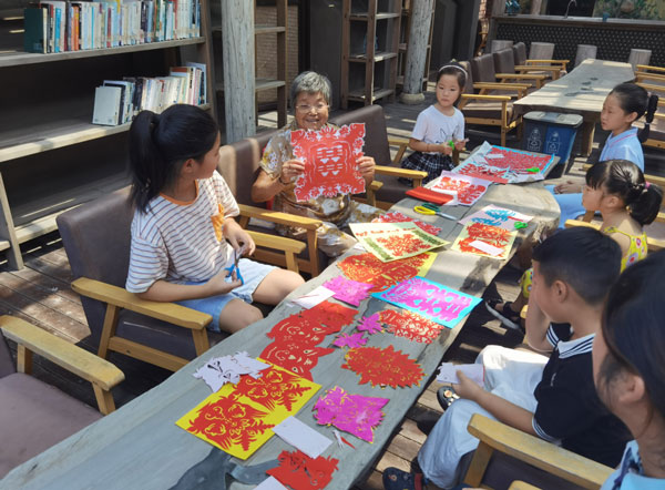 蠶花剪紙非遺傳承人高訓琴向小朋友展示剪紙作品。姚萍攝