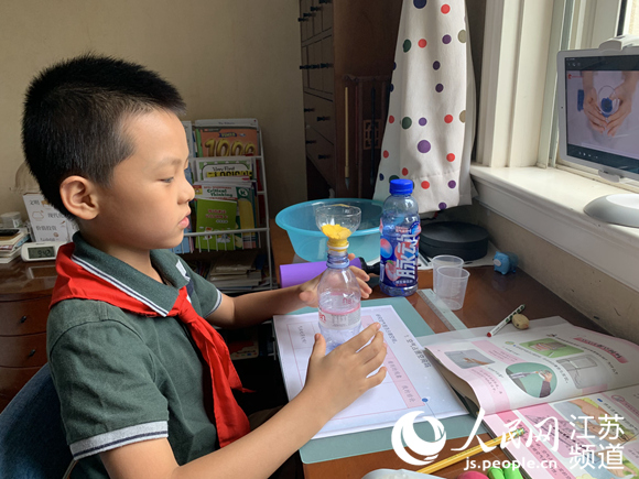 五老村小學三九班學生王梓澄在家上起了科學課。校方供圖