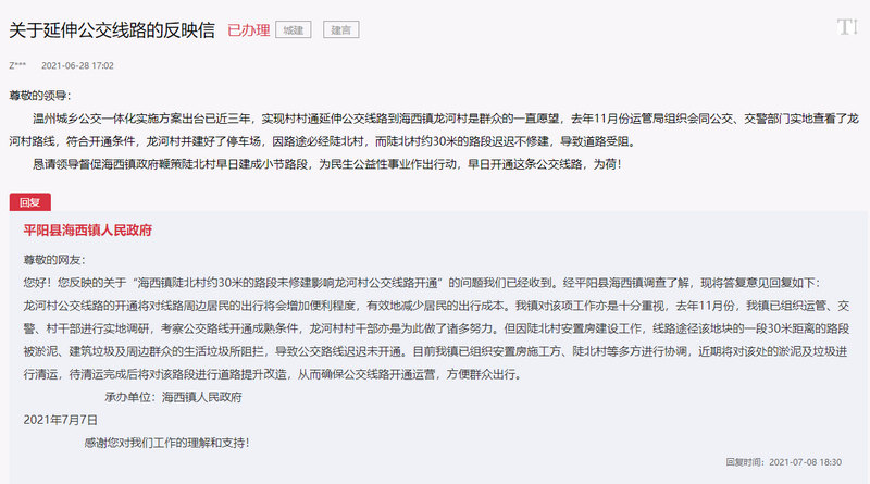 獲悉該網友留言后,平陽縣海西鎮人民政府高度重視,立即對網友反映的情況展開調查,并于7月8日作出回復。