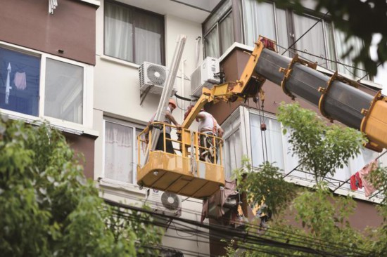 9月6日,在嘉興南湖區楓楊坊小區,施工人員在改造提升后的居民樓外部安裝空調排水管道,讓空調水統一排出,以減少排水噪聲和平臺積水。(王振宇)