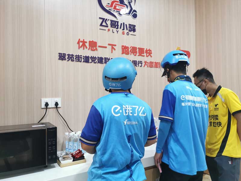 “前幾天下午沒單子,天熱得厲害,回站點休息又太遠,我就去了就近的翠苑四區驛站休息,吹吹空調降降溫,喝杯水。翠苑一區老年食堂我也去吃過,紅燒肉、豆腐口味都很不錯,干凈衛生!焙ぷ鳛榈谝慌w驗驛站服務的外賣小哥,對“飛哥小驛”贊不絕口。