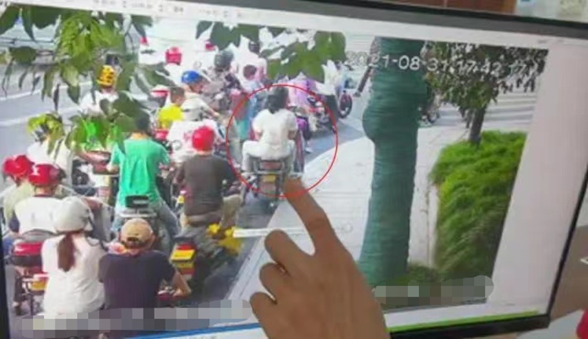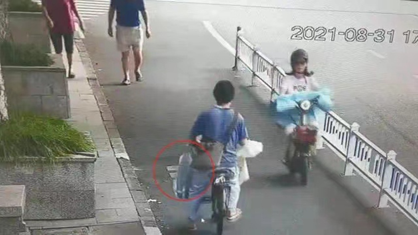 母女倆離開后,周利文回到監控室反復查看!叭绻愤厸]有的話,那很有可能是被人撿走了!敝芾陌凑占鸭褋G書包的時間往后推算,反復篩查了大量監控視頻。終于,他注意到晚上6點左右,一名騎自行車的男人手上拎著一只藍色的書包,像極了佳佳的書包。