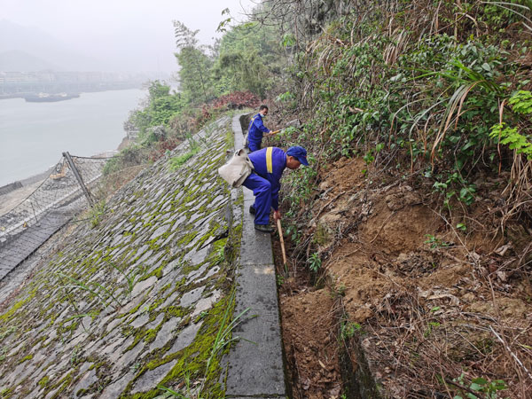 鐵路職工正在巡查線路,清除阻塞排水溝。金溫鐵道公司供圖