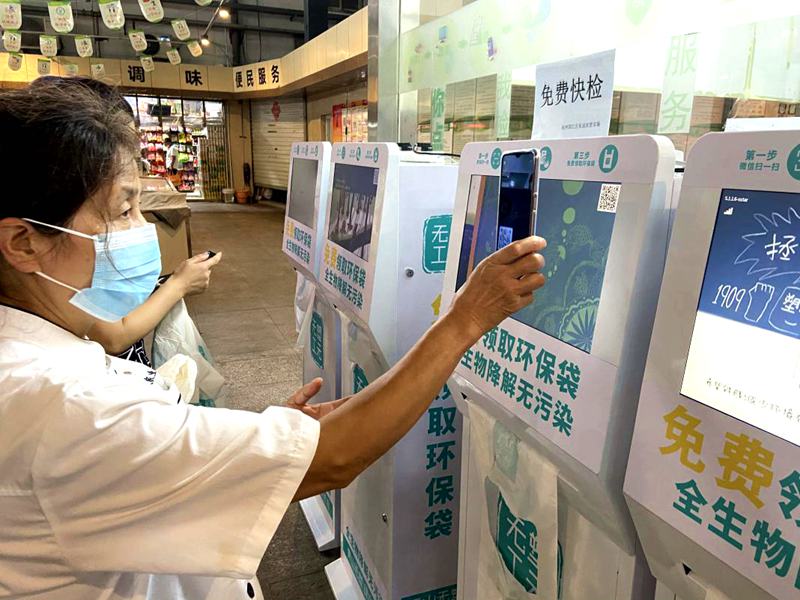 杭州市首批無塑環保袋智能發放機正式在濱江區長河街道冠山農貿市場投入使用,市民可掃碼自助領取。人民網 方彭依夢攝