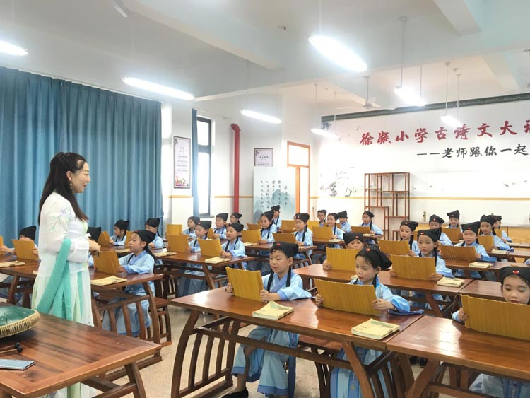 “小書童”們身著漢服,頭戴帽子,端坐桌前,書桌上放著《論語》與書簡;徐凝小學語文特級教師種麗也身著漢服,手拿教尺,站在學生中間。師生共同誦讀、吟唱《周南·桃夭》。