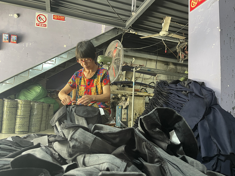村民夏松玉在剪西裝褲的線頭。人民網 王蕭蕭攝