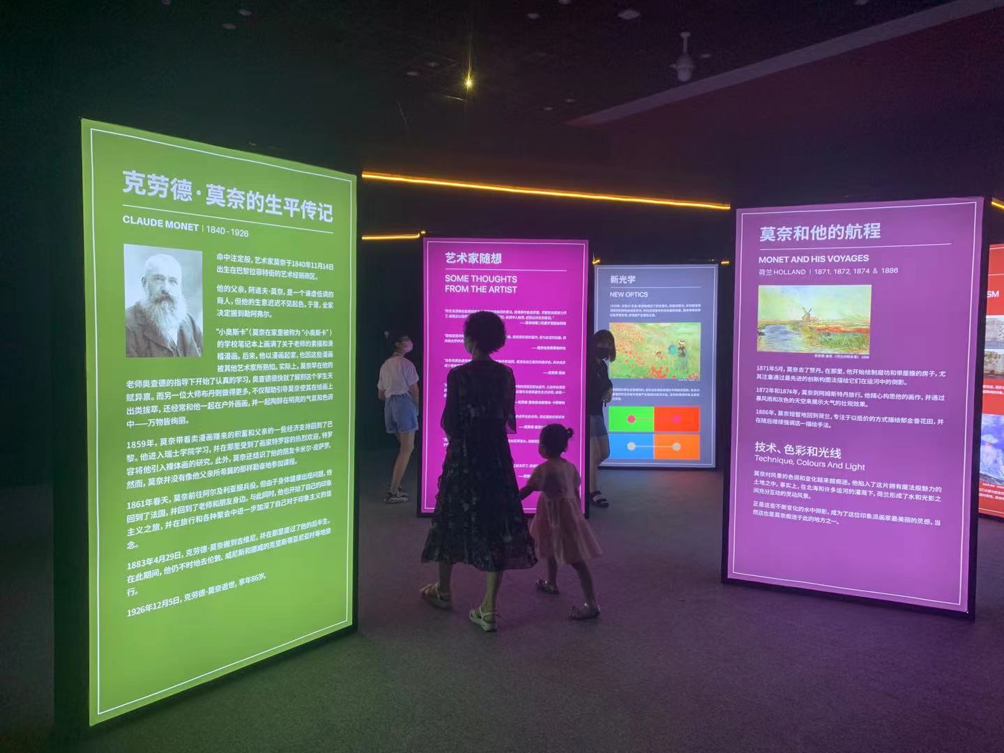 “莫奈是‘追光藝術大師’,我們利用300多平方米的沉浸式主廳,制作了30多分鐘的高科技全息全景影像,將他的作品分為春夏秋冬四個主題,讓觀眾可以全方位體驗并穿行在莫奈描繪的春夏秋冬美景里!蹦嗡囆g沉浸式體驗負責人譚甯說。