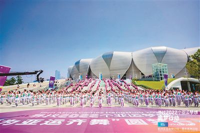 這邊,錢塘江堤岸上揮毫潑墨,畫出美好夢想;那邊,奧體中心上千雙手臂揮舞成風,齊舞亞運旋律……當《Asia,the sun rises!》的旋律響起,身著四色T恤的舞者,用動感活力的舞步展示著亞運夢想的力量和魅力。