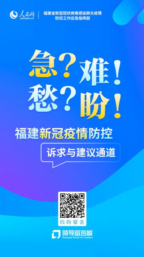 目前,“福建新冠疫情防控訴求與建議通道”留言正在加緊辦理中。疫情當下,您在生產生活中遇到無法解決的急難愁盼問題,歡迎留言。