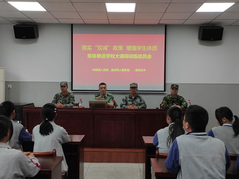 為堅決落實“雙減”政策,切實減輕學生負擔,增強學生體質,近期,湖州德清五中聯合湖州鐘管鎮人武部、退役軍人服務站開展了軍體拳進校園訓練活動。