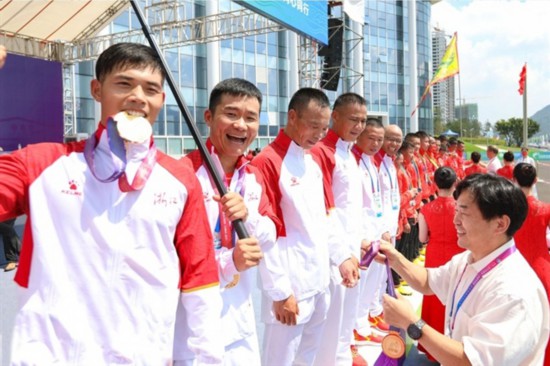 飛舟擊水,百舸爭流。近日,第十四屆全運會龍舟比賽圓滿落幕,由12名“硬漢”組成的溫州蒼南龍舟隊代表浙江省摘得男子組直道1000米、男子組直道500米和男女混合組直道1000米的桂冠,取得“三金一銅”的歷史佳績,交出了令人矚目的高分答卷,生動詮釋了奮勇爭先、頑強拼搏的龍舟精神。