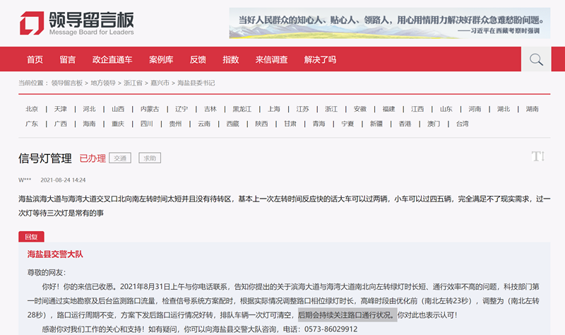 獲悉網友留言后,海鹽縣公安局交警大隊高度重視,科技部門第一時間通過實地勘察及后臺監測路口流量,檢查信號系統方案配時,根據實際情況調整路口相位綠燈時長,高峰時段由優化前(南北左轉23秒),調整為(南北左轉28秒),路口運行周期不變,方案下發后路口運行情況好轉,排隊車輛一次燈可清空。海鹽縣交警大隊有關負責人表示,后期會持續關注路口通行狀況,以便及時作出調整。