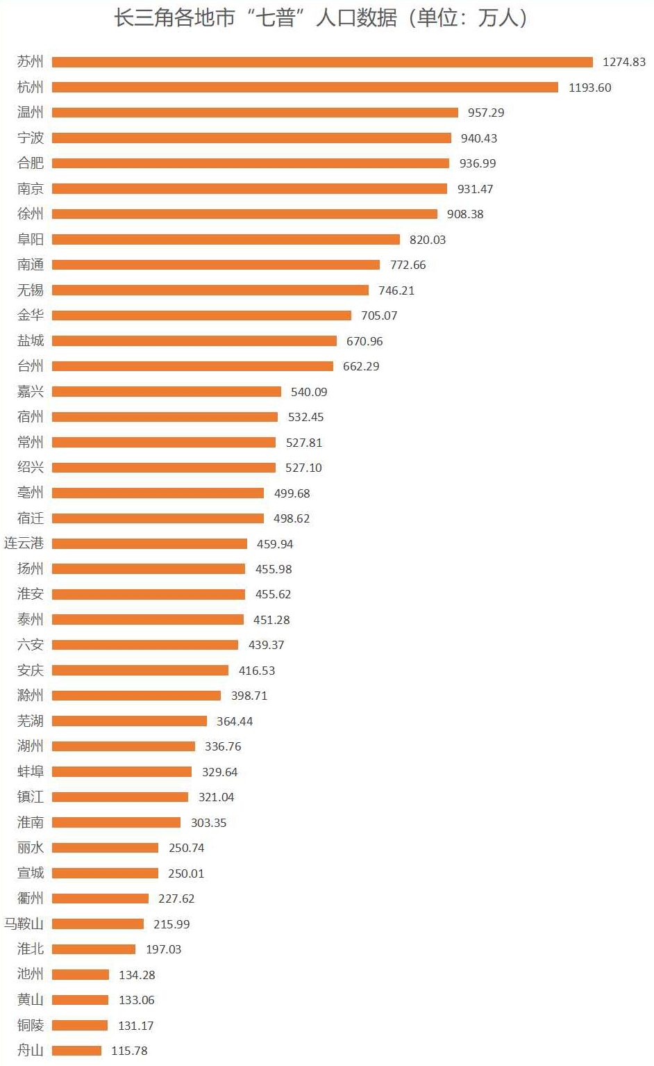 從長三角41個地級及以上市的常住人口規?,蘇州、杭州超過1000萬人級,位居前二,溫州、寧波、合肥、南京、徐州緊隨其后,均超過900萬人,前8個市合計占長三角人口總量的4成以上,逐步呈“一核多副”城市格局。18個市的人口規模超過500萬人級,其中江蘇7席、浙江7席、安徽3席,與2010年相比,增加常州、嘉興和紹興等3個市。杭州人口規模反超溫州升至前三,躋身千萬級行列,寧波、合肥反超南京和徐州升至前六。