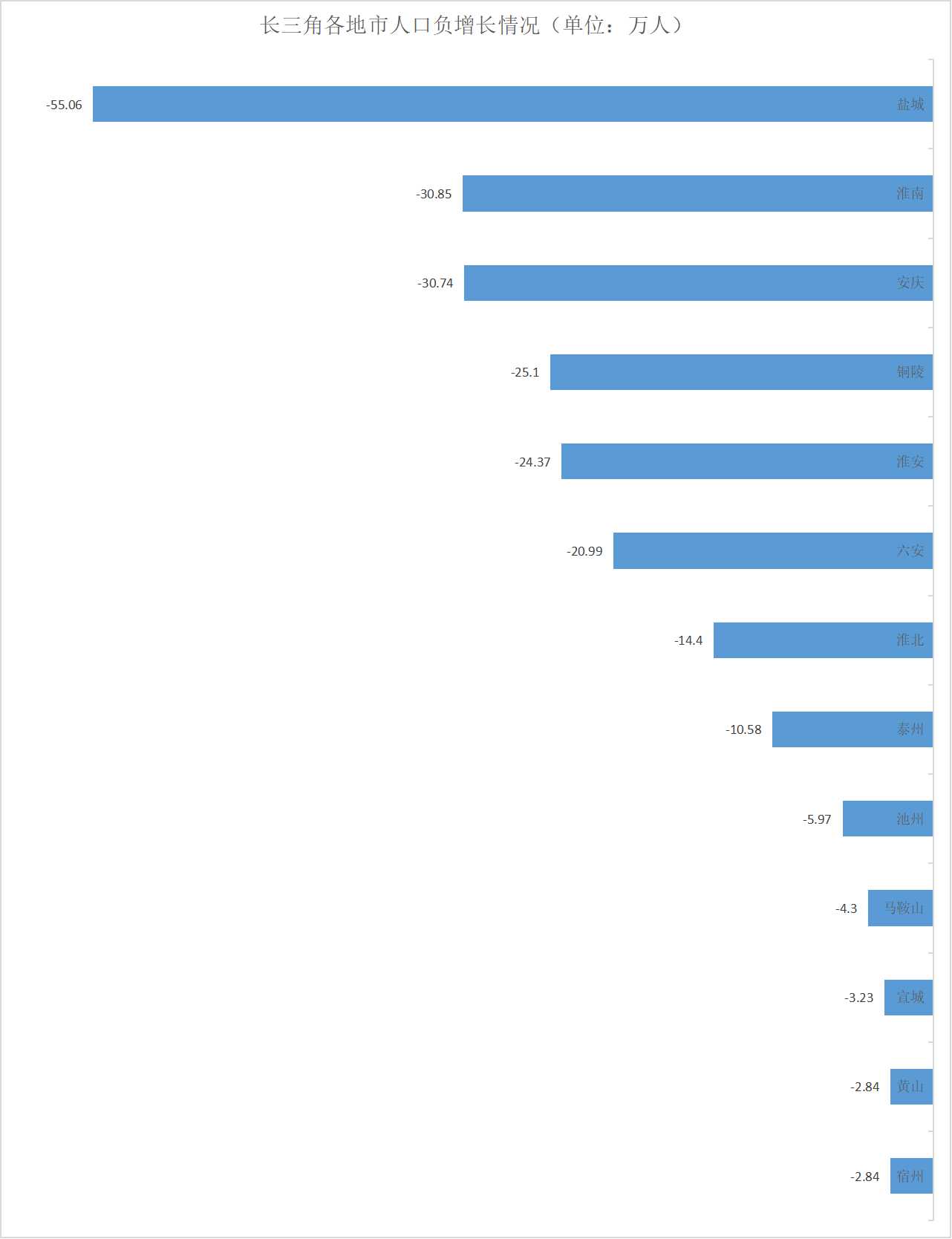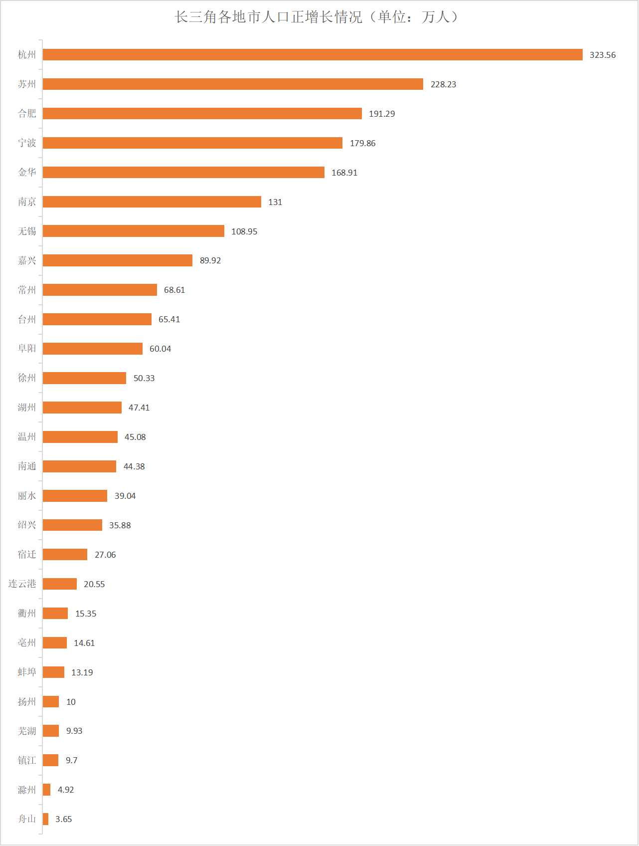 核心區域人口規模大,增幅也較大,外圍區域人口規模相對小,增幅相對也較小。41市中,常住人口增加的有28個,其中人口增量超過100萬的有杭州、蘇州、合肥、上海等8個市,這8個市常住人口規模合計達9216萬人,10年共增加人口1518萬,年均增長1.82%,遠高于長三角平均增速(0.87%)。增量合計占長三角人口增量的77%,增量最多的杭州,10年增加323萬人,年均增長3.21%。有22個市的人口增速低于全國平均水平,其中13個市為負增長,主要位于長三角外圍區域。