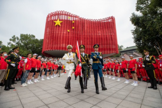 8時整,升旗儀式正始開始,由瑞安退役軍人組成的國旗教育館護衛隊隊員護送著五星紅旗,他們步步鏗鏘,整齊的腳步聲響徹國旗廣場。
