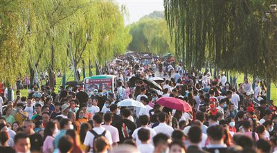 白堤上人頭攢動,在現場有效引導下游客進出有序。李忠攝